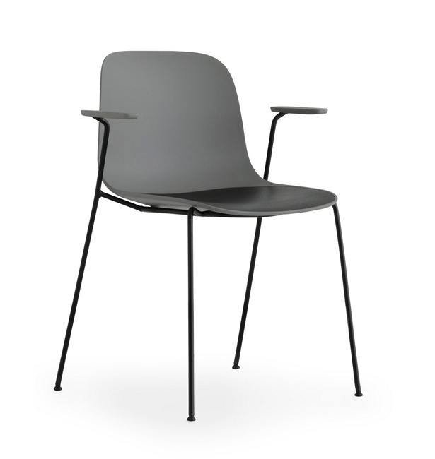 Materials: Armchair on tubular steel metal base with powder coat or matte chrome finish.  Seat and backrest in curved polypropylene.  Seat pad in polypropylene, wood, or fabric.  Stacks 6 chairs high.  If you are planning to use as a stacking chair, please call for an under-seat stacking pad.